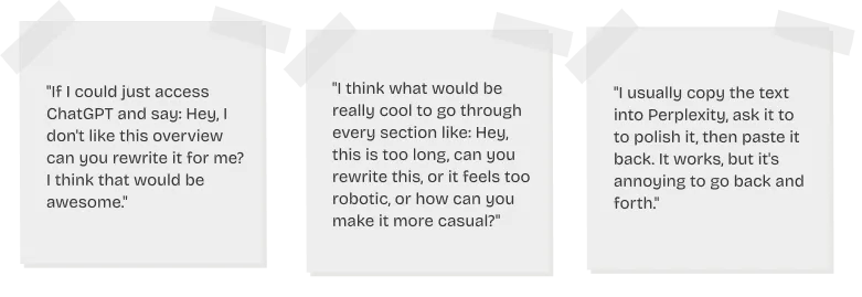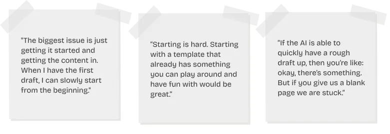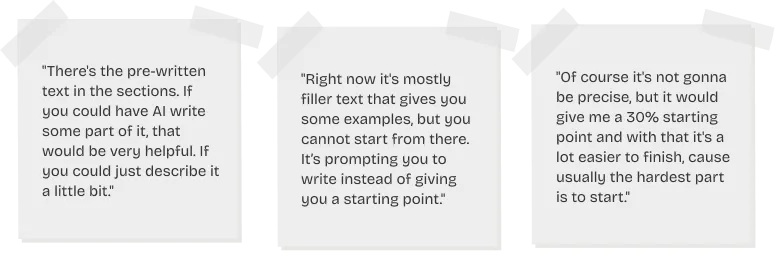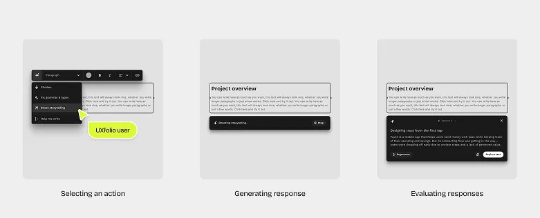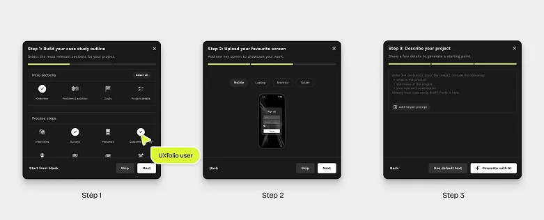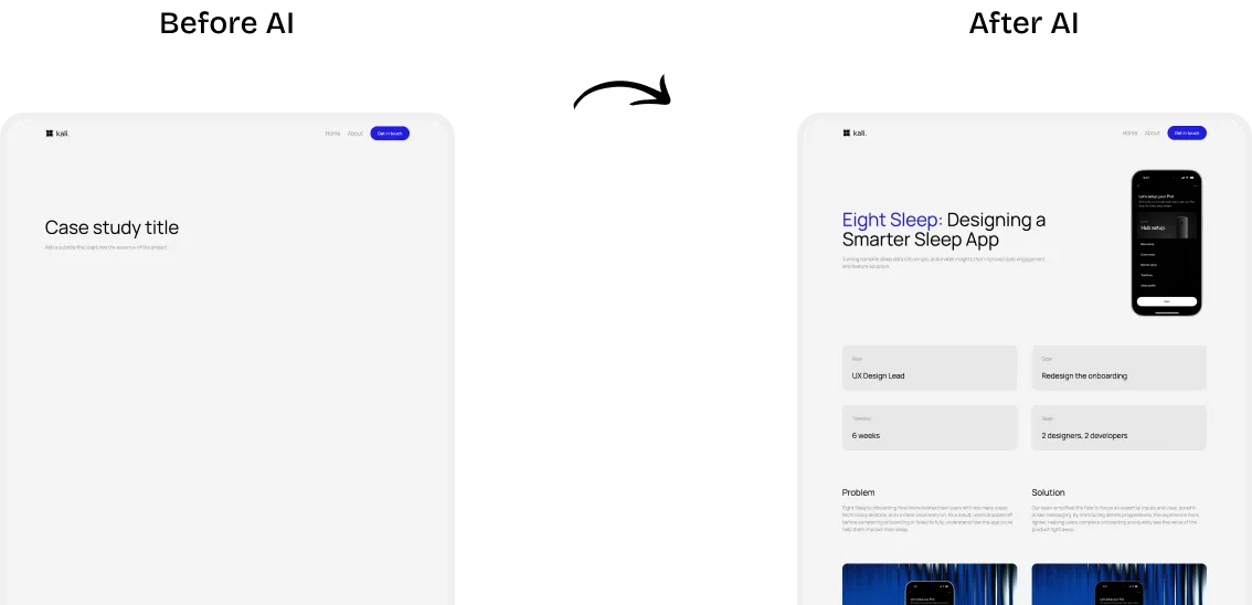 User interviews revealed a consistent pattern: starting a case study is the hardest part. Designers stare at a blank page, wondering how to structure it, what to write, and how to keep recruiters engaged. UXfolio already provided a default structure, but users told us the pre-written text (our solution before AI) felt like a placeholder, rather than a real starting point they could build on.